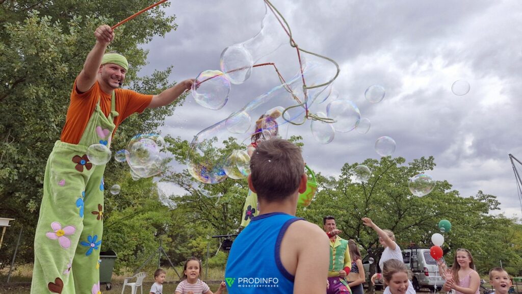 A gólyalábasok ámulatba ejtő mutatványokat adnak elő, megnevettetve kicsiket és nagyokat egyaránt. A kifejezetten interaktív előadás során előkerül többek között a hatalmas labdaugráltató vászon, amelyet a gyerekközönség mozgat az együttes mókázás érdekében… Ám ez még nem minden! A közös éneklésen és táncokon túlmenően a mutatványos előadás tartalmaz egy hosszabb óriásbubi show műsorelemet is, ami garantálja a felemelő látványosságot és az élményt…