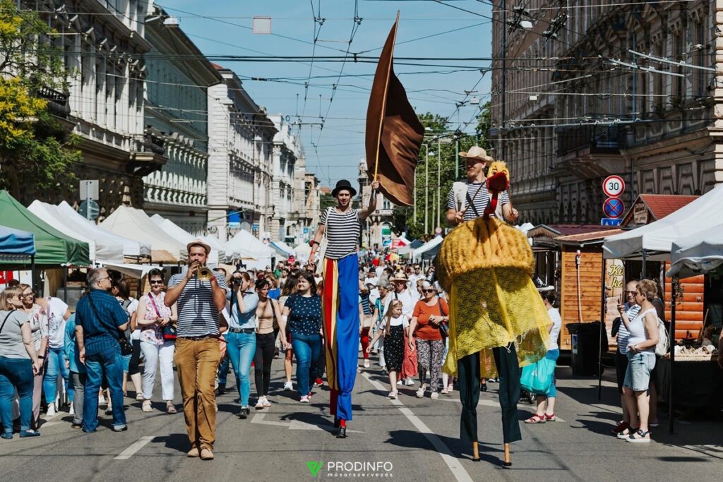2 vagy 3 fő gólyalábas mutatványosok, muzsikus, kikiáltó